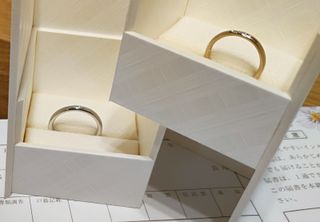 質感がなめらかで、ずっと着けていても心地よい。 しっかりした作りながらシンプルで、少し厚みがあるのがコロンとして可愛らしい。 ゴールドは色味が多く、お互いの好みや肌色に合わせて選びました。 デザインはイメージや印象を店員さんがしっかり聞いてくださり、また適切なアドバイスも頂きながら作る事ができました。
