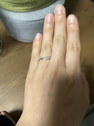 ウェーブの指輪が好みで指に付けたところ、とても可愛い印象で満足しています。 ダイアがたくさん付いているのが好みではなかったのですが理想の見た目の物が見つかりました。 旦那とはペアの指輪ではなくそれぞれ好みの指輪を購入しました。 お互いとても素敵な指輪に出会えました。