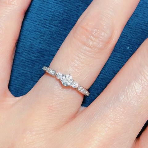 細身のリングに3つぶのダイアがあしらわれています。正面から見ても横から見ても、どの方向から見ても美しいです。シンプルで、着けると品がある感じがしてお気に入りです。いつも付けるわけではないので、特別感をもって使えます。