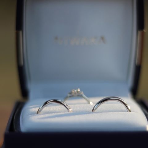 エンゲージリングとマリッジリングは一緒に購入しましたが、セットにはしませんでした。何より、エンゲージリングのエクセルシアフィーヌが気に入ったので…!エクセルシアフィーヌはリングが細く馴染みやすく、手が綺麗に見えます。 マリッジリングはクレアドヌーンフィーヌです。将来のことを考え、おばあちゃんになってもつけられるリングを選びたくて、あえて石などの装飾は無しにしました。その代わりにねじりの部分にツヤ消し加工を入れていただき、新郎のリングとおそろいの形にしました!