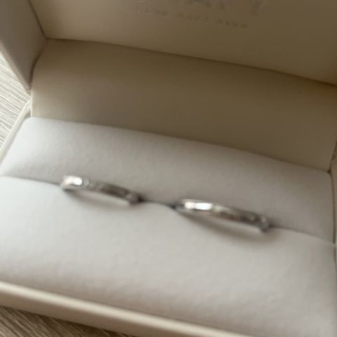 シンプルで飾らないところが私たちらしさを表しているようで即決でした。外側はマットで、内側がキラキラしていて、指輪を外した時も目で見て楽しめる点が気に入ってます。また、着け心地も良く、ある意味付けているけど付いてないような普段使いに馴染むつけ心地です。