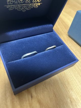 色はシルバーが大好きなので、二人ともシルバーにしました。あまりデザインもゴテゴテしているのが嫌だったので、どんな服にも合うシンプルなデザインにしました! 温泉に入っても錆びない素材が良かったので、プラチナにしました。