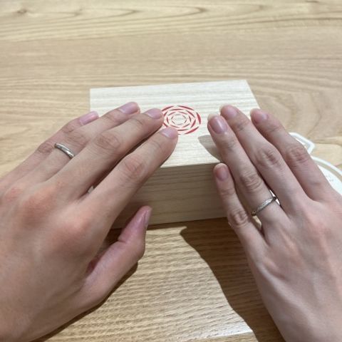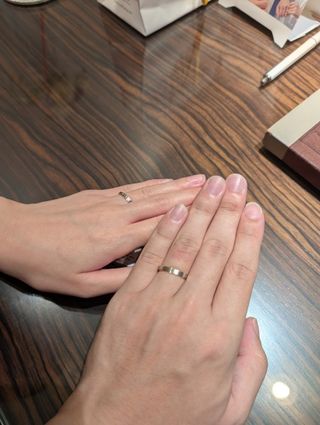 2人とも気に入って、かつ似合うデザインで探していました。他にも数店舗巡りましたが、2人とも一番しっくりきました。また、私は小さいダイヤを1つ外側に入れると決めていたため、それを叶えられたのもよかったです。