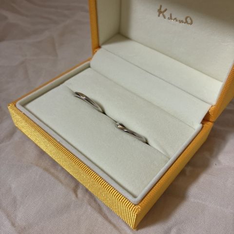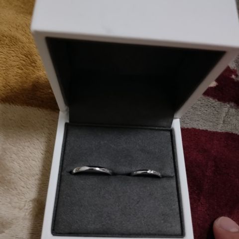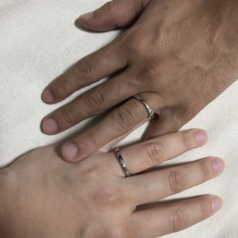 指輪タイプはウェーブで探していました。 女性のダイヤの入り方と、男性はひねりの部分だけマット加工でおしゃれさを感じました。 細いと指にくいこむので太さも、細すぎず太すぎずシンプル好きの私達にはちょうどよかったです。