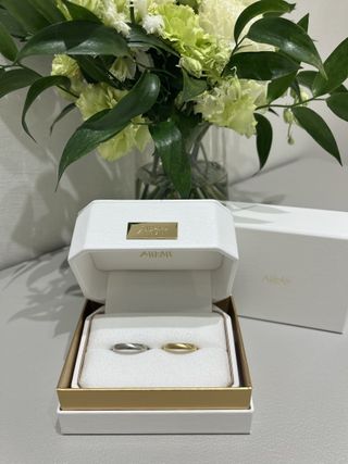 シンプルで飽きないデザインを選びました。 私はツヤツヤな仕上げですが、彼はヘアライン仕上げでそれぞれの好みに合わせて作れたのも魅力です。 婚約指輪は普段使いしかやすいように、ちいさなダイヤにしましたが、とても可愛く仕上がりました。