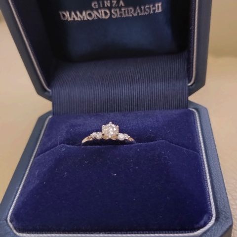 真ん中に大きめのダイヤ、左右に小ぶりのダイヤがありシンプル目だけど華やかに見れるデザインです。 真っ直ぐにダイヤが揃っている訳では無いのでデザイン性があり、指も細く見えて、またデザインが可愛くてお勧めです。