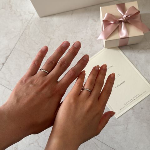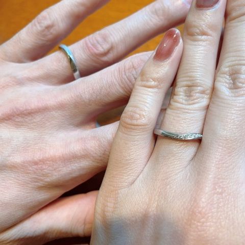 ウェーブのデザインが指に合っていた。 ダイヤモンドの石の数が多くキラキラとしていて手が華やかに見える。石が引っかかりづらくなっており、普段使いしやい。 男性側の指輪は艶消し加工されており、悪目立ちせず肌に馴染んでいた。
