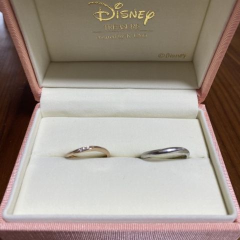 指が綺麗に長く見えるデザインです。 ミッキー&ミニーの刻印を入れるため、予算の都合上ダイヤの数をデフォルトの5個から3個へ減らしましたが付けてみるとあまり気にならず、「3」という数字も好きなので大満足です! デザインはシンプルなのが良いけど、ディズニーの刻印を入れたいというカップルへオススメです。ボックスもディズニー限定デザインで可愛いです。