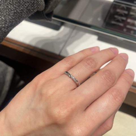 指輪の選定から購入まで彼が全て行いました。 私は様々なデザインの試着を行いました。 メレダイヤのデザインの指輪が欲しく、こちらを購入したそうです。ストレートのデザインですが、指先に向かって細くなっているため、指が綺麗に見えます。