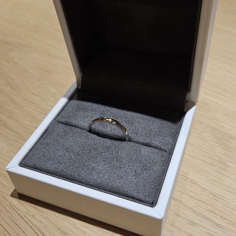 シンプルなデザインです。パートナーが購入し、プレゼントしてもらいました。私がさりげないデザインの方が好きなので、小さめで王道のデザインのものを選んでくれたようです。サプライズでもらいましたが、一目で気に入りました。 画像ではみえにくいですが、リングには流線形にストーンが散りばめられ重ねづけも綺麗になります。
