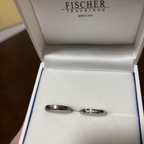 シンプルですが、プラチナがすごくツヤツヤしていてダイヤの輝きも強いと思います。私たちはベースになるデザインからダイヤの数や指輪の幅などを自分たちの要望を伝えて変えてもらいました。シンプルなので職場につけていっても浮かず、しかしふとした時にダイヤがキラッと輝くのでとても気に入っています。また、夫は装飾品を身に付けるのが苦手なのですが、こちらの指輪は着け心地が良く毎日つけています。本当につけているのを忘れるくらい着け心地が良いです。