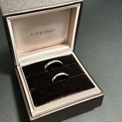 シンプルイズベスト+ワンポイントを意識してデザインを決めました。斜めラインが入っていて、女性側のリングには小粒ダイヤが埋まっています。夫婦ともに手作業が多い仕事のため、お店の方には傷が付きにくい、目立ちにくいタイプの物を選定していただきました。