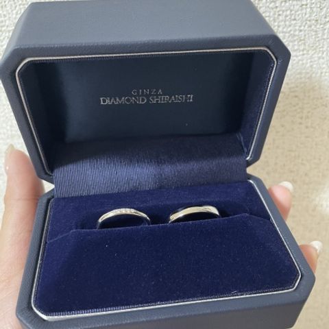 シンプルなデザインながら、タンタルの素材を選んだので少し黒っぽくてかっこいいデザインになりました。内側に2人の名前を刻印していただいたのもお気に入りです。普段使いがしやすそうでこれから毎日つけるのが楽しみです。