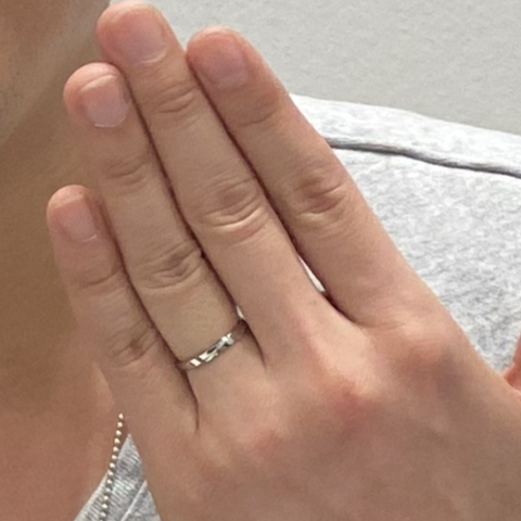 ねじれたデザインで、指輪との境目のむちっと感がないのが嬉しいです!キラキラだけど指輪が目立ちすぎることなく、指に馴染みます!ダイヤが埋め込まれているのでとれにくく、つけっぱなしでもOKなところが気に入りました。