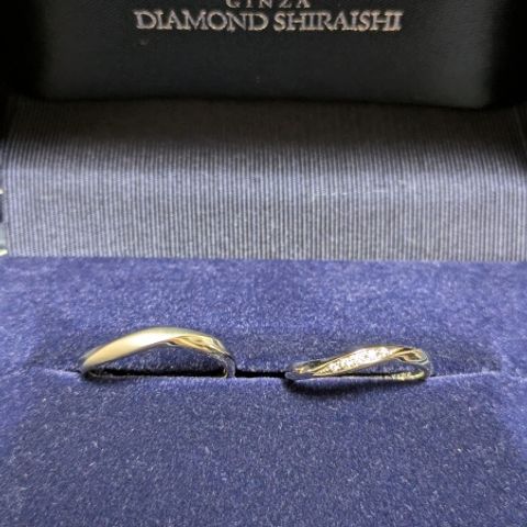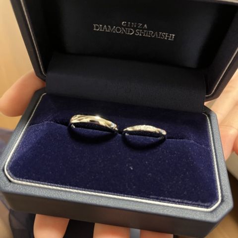 シンプルだけどしっかりとしたウェーブラインのあるリングが良くて「Milky Way」にしました! ダイヤがついてるデザインもかわいかったのですが マット仕上げのデザインの方が好みだったので 新婦もメンズのデザインでお仕上げしてもらいました♩
