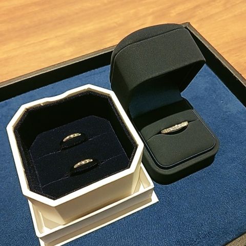 正面からもダイヤが綺麗に見えますが、上下に埋められているため、上から見た時にとても輝きがあり美しくみえます。夫の指輪は艶消しをなしにして光沢のあるものにしました。シンプルですが、少しウェーブがかかっており素敵です。