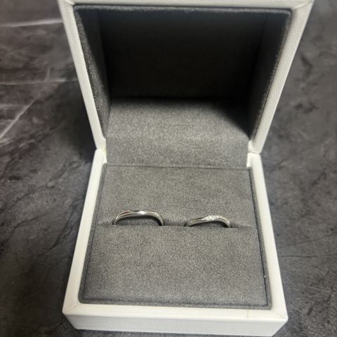 ホワイトリリーという指輪で、横からみるとお花のように見えます。ダイヤモンドの輝きを引き立てるシンプルなデザインです。着け心地も良く、指を曲げても痛くなりにくいと感じました。結婚指輪をまだ決めていなかっため、重ね付けをする際にどの指輪を選んでも合うこのデザインにしました。