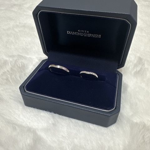 男性用、女性用でペアになっているものにしました。シンプルで2人とも気に入って即決しました! 女性用は小さな石が7個付いています。シンプルでキラッと輝くのが気に入っています。男性用は少しマットな部分があり、おしゃれです。