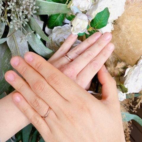 細すぎず太すぎず、さりげないウェーブが入っているため、指が綺麗に見えるところがお気に入りです。鍛造製法で丈夫であるのに、華奢なデザインでサイズ直しも可能である点も気に入りました。相手の指輪はペアの物ではないですが、ペアに見えるデザインが近いものも多く、選ぶのを楽しめたようでした。