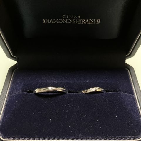 少し個性的なデザインなのが気に入りました。 2人のデザインはほぼ同じなのですが、女性用の方は真ん中に宝石があしらわれていて綺麗です。また、互い違いに加工が可能で、お揃いだけどお揃いじゃないデザインが出来るのも良かったです。 よく御祝儀で使われる水引をイメージして作られたデザインで、末永く結ばれる、という意味が込められているところもとても良いなと思いました。