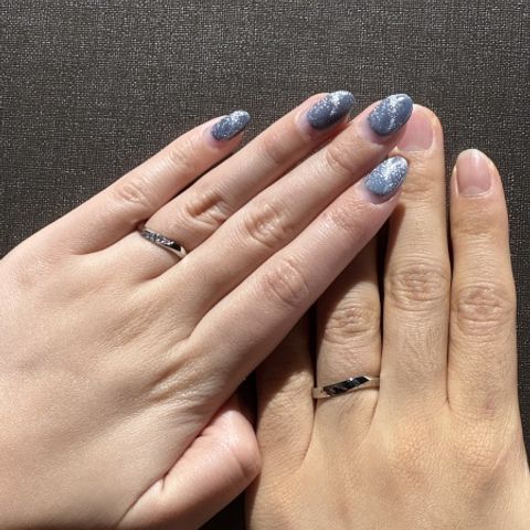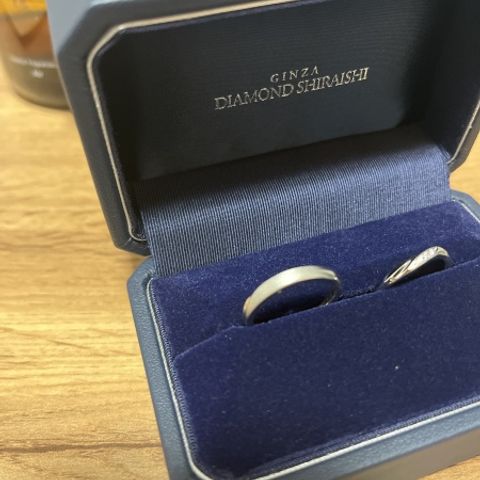 2人の指輪を「槌目加工」と「斜め削り」でお揃いにした上で、女性側を映える色合い、男性側をアイスマットにしたことで、ベースは同じでもお互いに個性のある指輪を作ることができた。槌目加工による光の反射が想像以上に綺麗で、気に入っている。