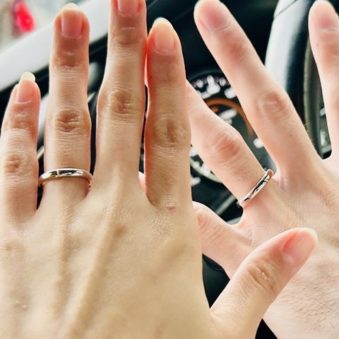 男性側はシンプルかつ日常的に付けやすいもの、女性側はダイヤモンドが輝くデザインを探しており、ぴったりなものが見つかった。 ずっと付けていたいデザインであり、それぞれの指輪のデザインに思いもあるのが良かった。オプションで刻印や、誕生日石等も入れることができ、一生大切にしたい指輪となった。