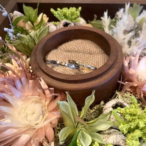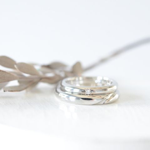 お互いの指輪をお互いで作れるところ。多彩なデザインからアレンジできて、どんな風に個性を出し、かつ日常使いができるデザインにするか、考えるのが非常に楽しかったです。 中でも、誕生石を入れる際、悩んでいたところ「双子ダイヤ」をオススメされました。ひとつのダイヤから2つ生まれる、2つでひとつのダイヤだそうで、結婚指輪にぴったりだと思い、双子ダイヤを入れることに決めました。 わたしは表面に八光堀りで、夫は内側に入れ込みました。 シンプルなのにこだわりが光っていて、本当にお気に入りです。