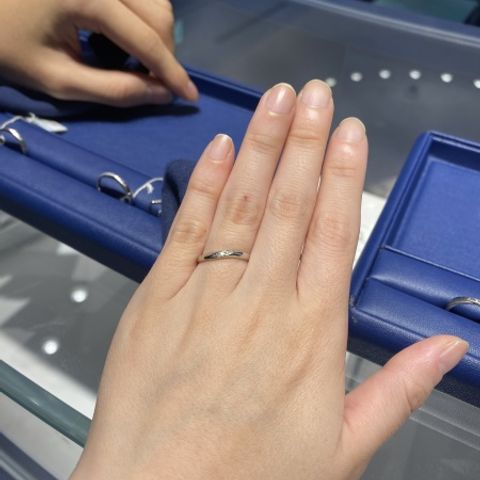 シンプルで飽きのこないリングを選びました。指の関節が太いのがコンプレックスでしたが、様々なタイプを試着させていただき細めのリングが意外と似合うことに気づきました。パートナーのリングも細めが似合うので合わせてこちらに決めました。