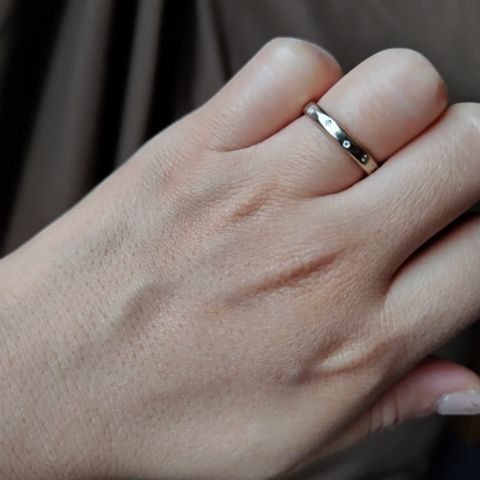 夫がプラチナ、私がゴールドという色の組み合わせだけ決めて探していたところ、デザインがシンプルなものがあまりなく、こちらの指輪を見つけたときにこれだ!と思いました。どちらも内側にダイヤが埋め込まれていて、さりげないデザインも気に入りました。光の加減で斜めの線が入るのでパッと見た感じも可愛いです。傷がつきやすいと説明がありましたが、それもまたナチュラルな雰囲気になってくるので全然気になりません。太すぎず、細すぎずなので違和感なく馴染みます。結果的に他のお店では一切見ずに購入しましたが、大満足です。