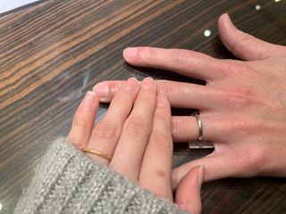 指輪のデザインがシンプルかつ可愛くペア感もあってとても気に入っています。 素材の違ったコンビリングがあまり数少ないいうことでそれもまた特別感があっていいなと思いました。 2人で指輪を見た瞬間にこれだ!っていなった指輪でした。(笑)