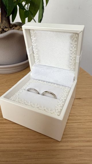 指輪のデザインはシンプルなもので、好みのものを選ぶことができました。肌の色がお互い違いがあるので、ゴールドとプラチナでリングの色は違いますが、同じ形でマット加工、ダイヤをつけることで統一感が出たと思います。