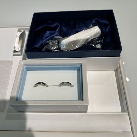柔らかいウェーブにキラキラのダイヤがついていてとても綺麗で可愛いです。女性も男性も指が綺麗に見えて、付けるとずっと見つめてしまいます。また指輪の箱も木の温もりがあり、インテリアに馴染むところも良かったです。