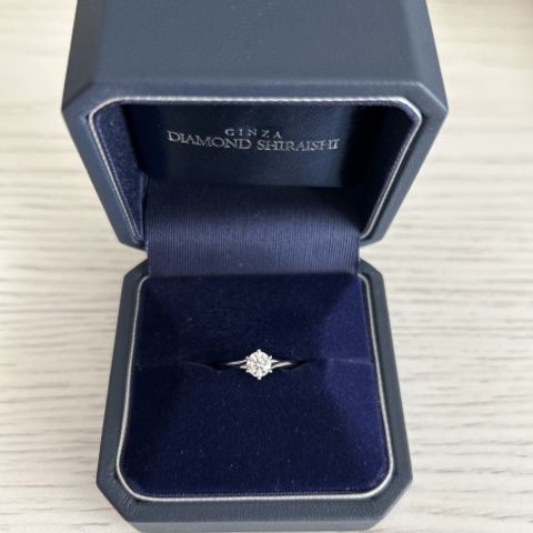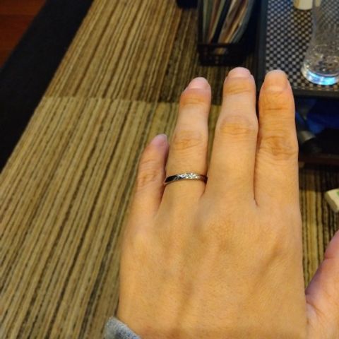 シンプルの一粒ダイヤのデザインです。細身のリング幅が希望でしたので落ち着いた印象で結婚指輪との重ね付けにも馴染んで気に入っています。プロポーズの時にダイヤの石のみを彼が選んで渡してくれたので、そのダイヤを使って作っていただいてよかったです。