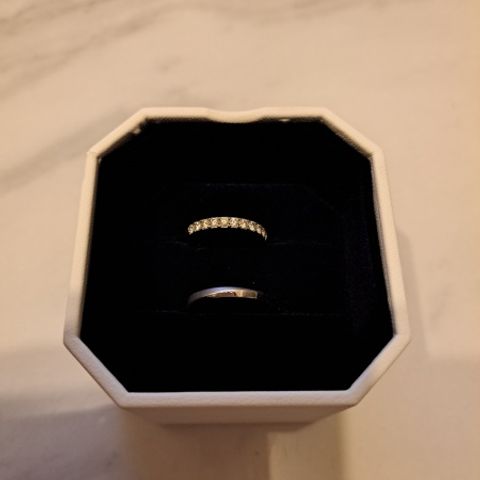 婚約指輪とセットのデザインとなります、女性側は小さなダイヤモンドがついており、重ね付けした際の光り方がとても綺麗でした。 男性側も同様なデザインですが、一部マット加工されており、アクセントとなっております。 日常的にも馴染むシンプルさですがねじりのデザインが合わさってとても可愛いです