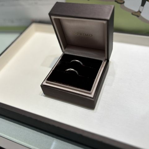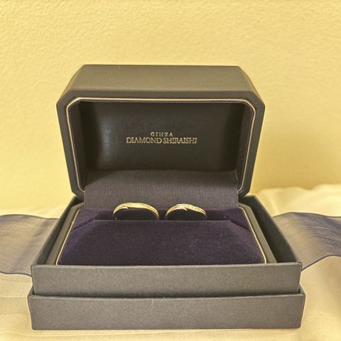 シンプルなデザインかつ自分達らしく、お互いに似合うものを探していたので半分カット加工してあるこのデザインは、仕事でつけていても主張しすぎず、けれど角度によってはキラキラっと輝いてくれるところが良かったです!