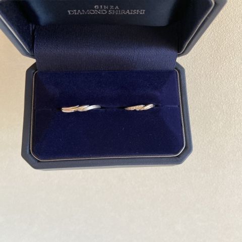 ウェーブ上にきらめくダイヤが散りばめられており、何十年先も素敵な指輪を付けていられる気がします。 婚約者とはペアではありませんが、お互い気になった指輪のデザインが似ていた事もあり、決め手となりました!!