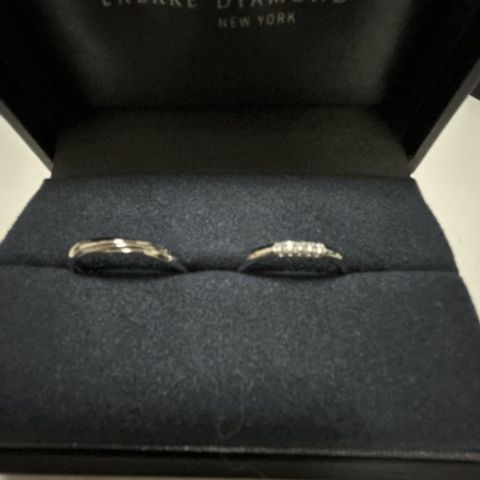 女性は少し細目のS字型 ダイヤ7石のシンプル、プラチナ素材 とっても可愛く着け心地がいい指輪 男性は少し太めシンプル、プラチナ素材 セミオーダーで試着や説明を伺いながらのオーダー。 結婚指輪で好みが違うので形や細さではないものの、指輪の裏に刻印が出来き共有する事が出来る良さがあります。
