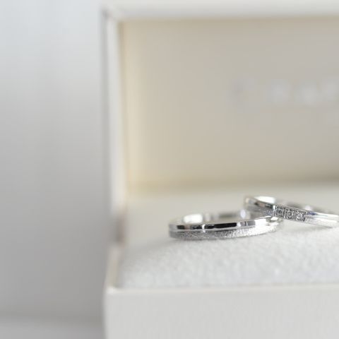 指輪を選ぶポイントとしてシンプルでずっとつけていれることを第一に考え選びました。 妻が選んだデザインはダイヤが1つついており、どんなシーンにも合い、婚約指輪と合わせて付けてもお互いを邪魔しないデザインになっております。 私のデザインは全体はマットな素材に一部磨きのかかったシンプルかつ遊び心のあるデザインにしました。