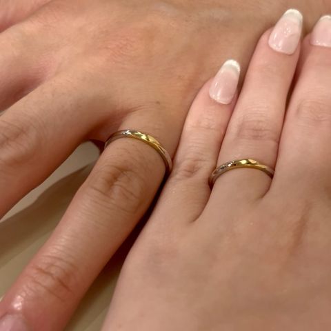 オーダーメイドした槌目加工が光に反射してキラキラ輝いて綺麗です。 新婦側の側面にはスターダスト加工を入れていただき、華やかで可愛く仕上げていただきました! 夫婦でデザインはほぼ同じですが、若干の違い(好み)を取り入れていただき、オリジナルの指輪ができて大満足です!