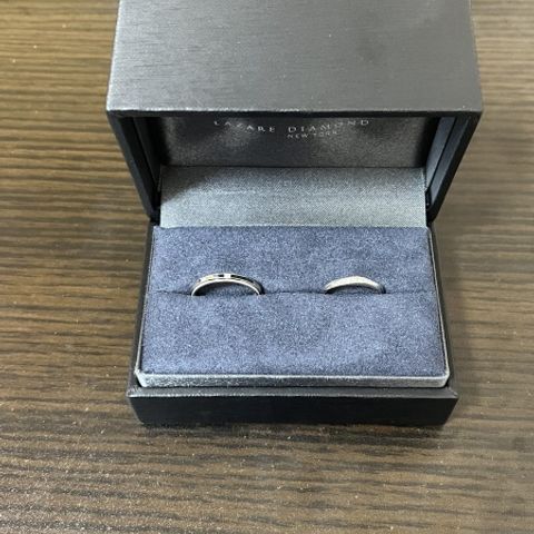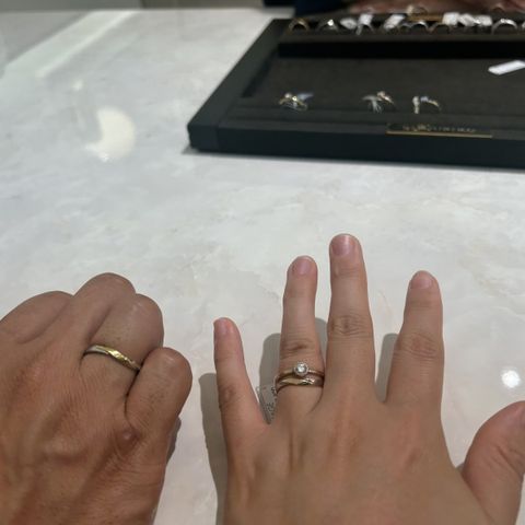 シンプルなデザインの指輪が豊富で、かなり悩みましたが、夫婦別のデザインの指輪に決めました。ダイヤの有無も形も違いますが、共通してマット加工がされてあるものにしました。2人で好きなデザインにしたので、満足しています。