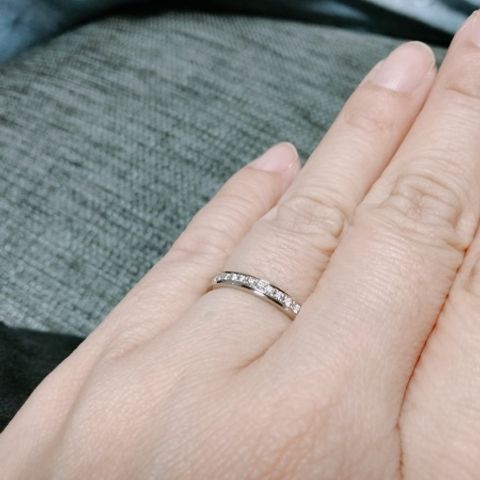 そもそも、婚約指輪は購入するつもりなく、先に結婚指輪を購入していました。やっぱりと思い考えたのが婚約指輪!!って感じは気になって使いにくそうだったのと、スタッフの方がつけていたのに惹かれてハーフエタニティを探していました。エタニティは服装や場所も気にせずさりげなく輝くところが好きです!