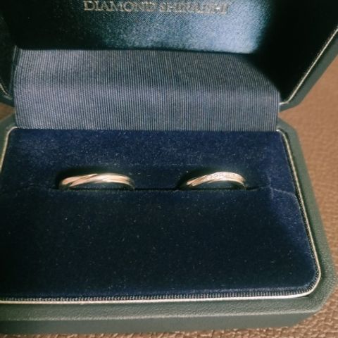 お互い、自分が納得するデザインの指輪を長く着用したかったので、セットになったデザインにはこだわらず、それぞれがデザインや着け心地など総合的に気に入った物を購入しました。 私の指輪は太すぎず細すぎない、ストレートとウェーブの中間のような形で、ダイヤが斜めにラインで入っている物にしました。いくつかのブランドで色々なデザインを見ましたが、結局このデザインが私には一番上品で素敵に見えました! 旦那の方は、ストレートで上下にミル打ちされ、真ん中にダイヤを一粒入れたものにしました。男性ですが、私の試着を見ているうちに自分もダイヤが欲しくなったようで、完成した指輪を見て満足していました。 デザインが全く違うのでお揃い感は全くありませんが、結果的に2人とも大満足しています。