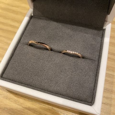 婚約指輪との重ね付けをした時、綺麗に見えるものを探していました。シンプルでかつフィットするV型の指輪を選びました。また結婚指輪としては珍しいピンクゴールドにしましたが、全体の仕上がりも含めてとても可愛くて満足です。