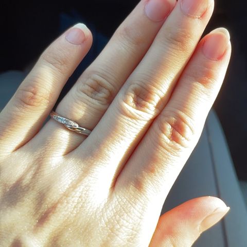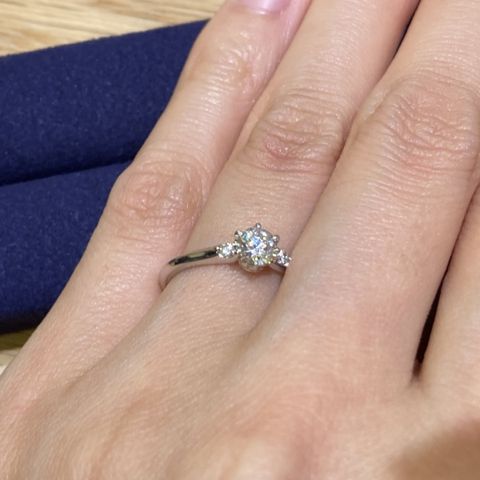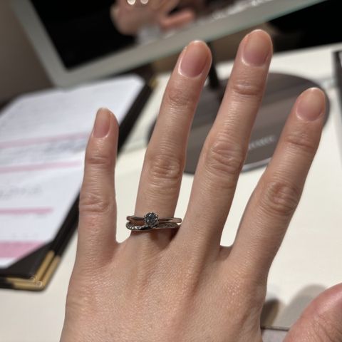 ダイヤモンドの輝きが他店と違い美しいです。 自分の手や指の感じで似合うのがウェーブの形だったため指がきれいに見えるデザインに出会えました。 また新発売の発売日が彼からプロポーズしてもらった日だったため運命を感じこの指輪に決めました。
