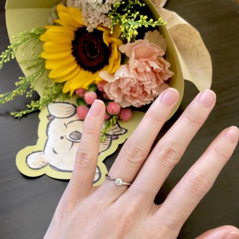 Foulasonという花モチーフの指輪にしました。色々ある中私はパンジーにしました!プロポーズリングということであとで指輪を選ぶのですが色々あってかなり悩みました。シンプルかつ可愛いものを選べたのでよかったです。