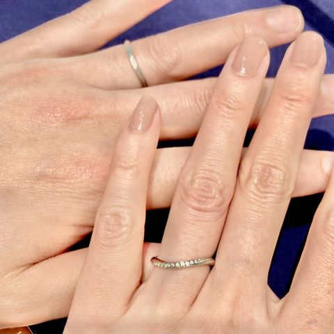 元々、2人とも骨張っている手ですが、この指輪は少しウェーブがあるので、手が優しく見えるデザインで気に入ってます。また、一色だけでないデザインのため、他の人がつけているのを見たことないデザインだったのも選んだ理由です。