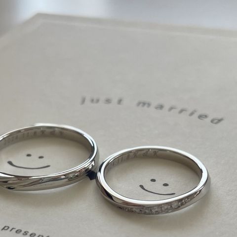 付け心地が良く、デザインが可愛いです。二人の指輪をお揃いのデザインにして、奥さんの指輪にはダイヤとスターダスト、旦那の指輪は同じデザインのツヤ消し加工を施しました。刻印は結婚記念日とお互いのイニシャルを入れました。
