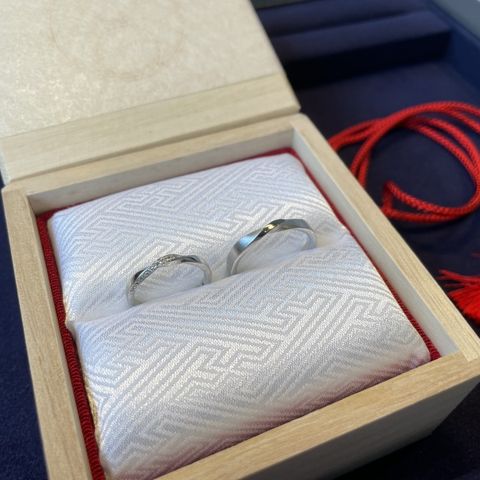 ペア感のあるデザインですが、ダイヤやヘアラインで男性側と女性側のデザインに差をつけているところがとても気に入りました。また、「紙縒」という名前と指輪に込められた意味、デザインがぴったりでとても素敵な指輪だと思いこの指輪を選びました。