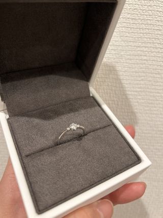 箱を開くとダイヤモンドがキラキラしていてとても輝いています。彼女にすごく似合っています。婚約指輪をはめた時左手の薬指がとても綺麗に見えました。リングのところに下の名前の英語のイニシャルを刻印してるのも世界に一つしかないと証明する指輪です。