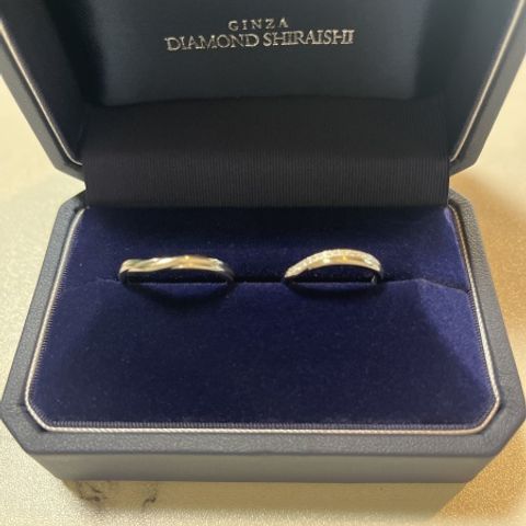婚約指輪は、ブーケというデザインのものでとてもキラキラしていて華やかで気に入っています! 結婚指輪は、ダイヤが斜めに入っているデザインにしたので、まわすと何もついていないシンプルな面にもできて2wayで楽しんでいます!